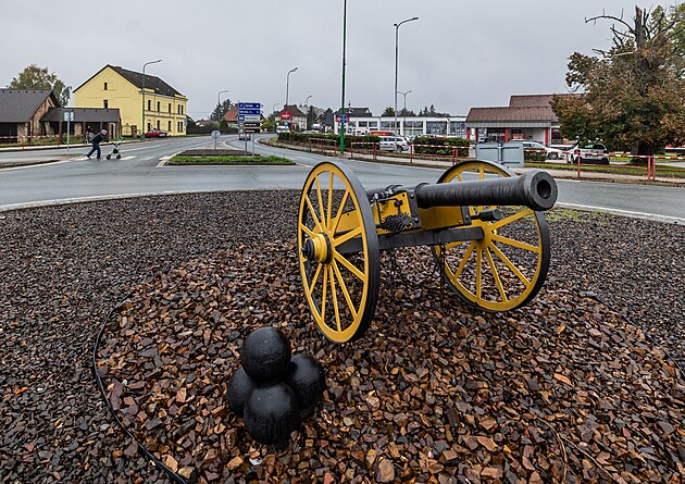 Okružní křižovatka Na Špici s poutačem na josefovskou pevnost (29. října 2024)