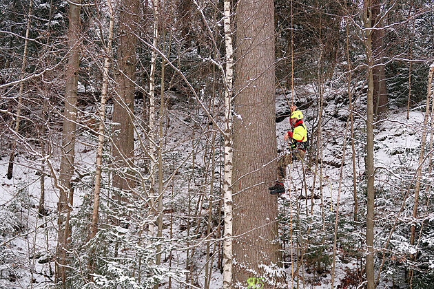 Stromolezec a arborista Jan Janoušek zdolává u sjezdovky v Harrachově pětatřicetimetrovou jedli.