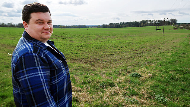 Starosta Tetína Matěj Hlavatý (STAN) ukazuje pozemky pro průmyslovou zónu.