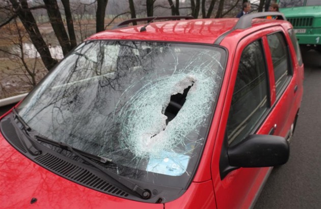 Při nehodě utrpěl řidič osobního auta lehké zranění. Kámen podle policie ještě předtím, než vlétl do vozu, několikrát poskočil po silnici.