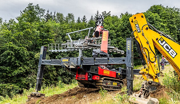 Speciální dálkově ovládaný jeřáb instaluje podpěry nové lanové dráhy v areálu Marta I v Deštném v Orlických horách.