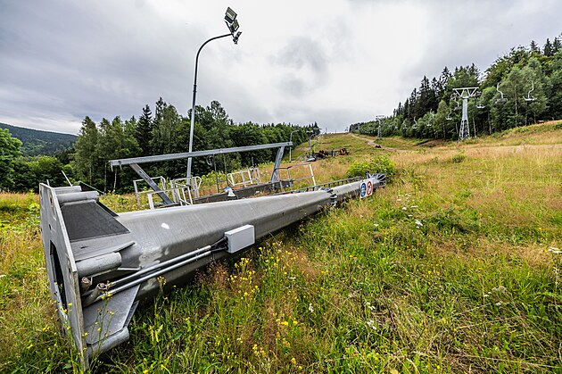 Nová lanovka roste po levé straně svahu. Do zimy dělníci demontují starou dvousedačku napravo.
