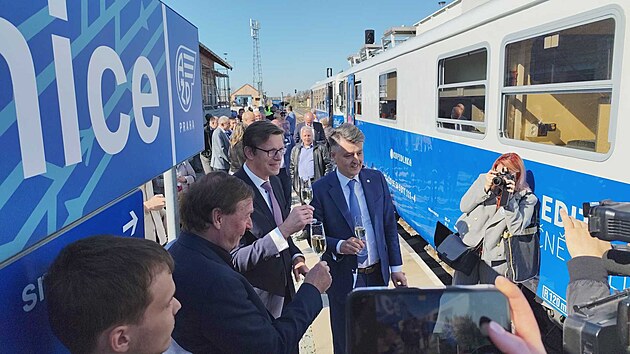 Na zahájení provozu autonomního vlaku připili (zprava) generální ředitel Správy železnic Jiří Svoboda, ministr dopravy Martin Kupka (ODS) i generální ředitel AŽD Praha Zdeněk Chrdle. (4. dubna 2025)