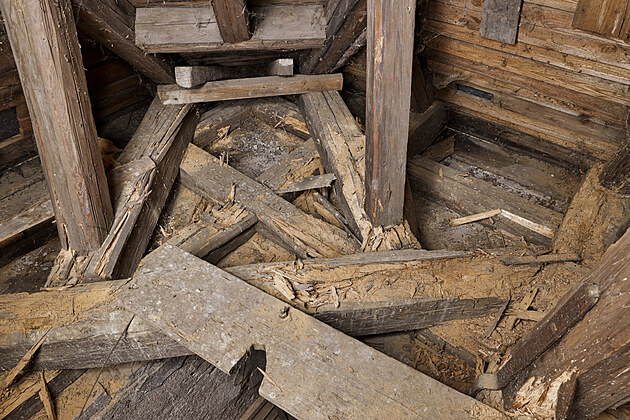 Poškozený krov na věži černilovského katolického kostela (únor 2022)
