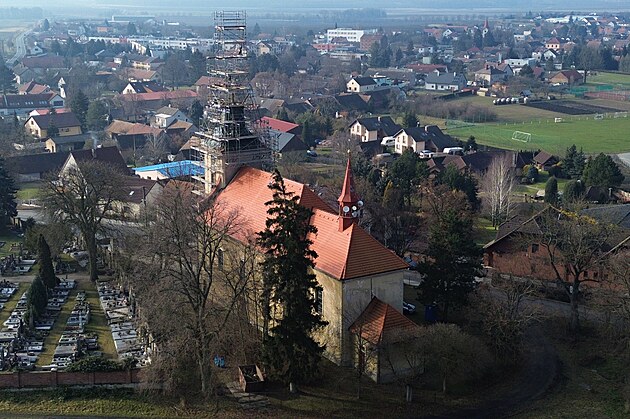 Pohled z dronu na opravovaný římskokatolický kostel v Černilově (4. února 2025)