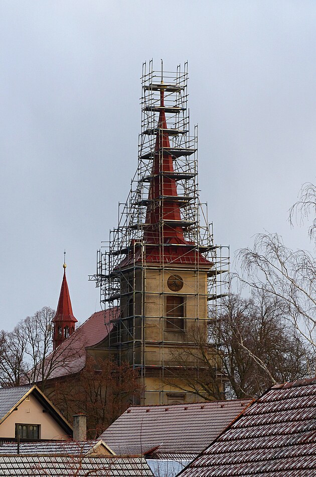 Farnost opravuje věž kostela Nalezení sv. Štěpána v Černilově na Královéhradecku. (3. ledna 2025)