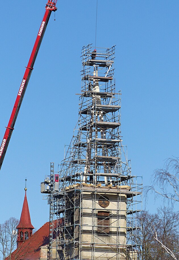 Řemeslníci s jeřábem spouštěli do věže kostela v Černilově střední trám i krokve. (18. března 2025)