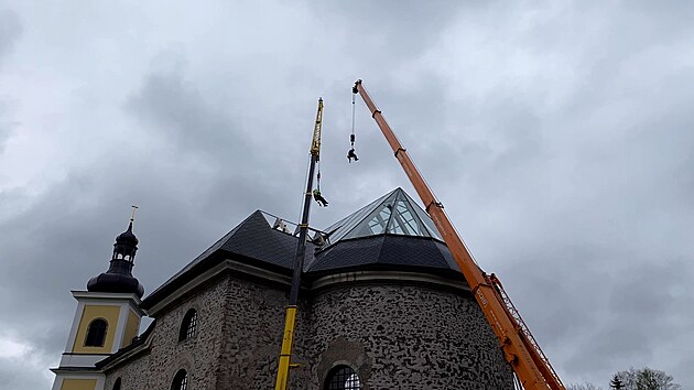 Jeřáb stěhuje skla na střechu kostela v Neratově