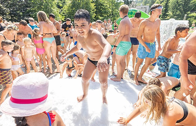 Děti řádily ve sněhu na koupališti v Náchodě. (15. srpna 2025)