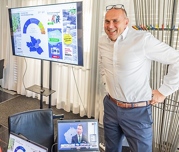 Petr Koleta ve volebním štábu ANO v Hradci Králové. sleduje průběžné výsledky. (21. září 2026)
