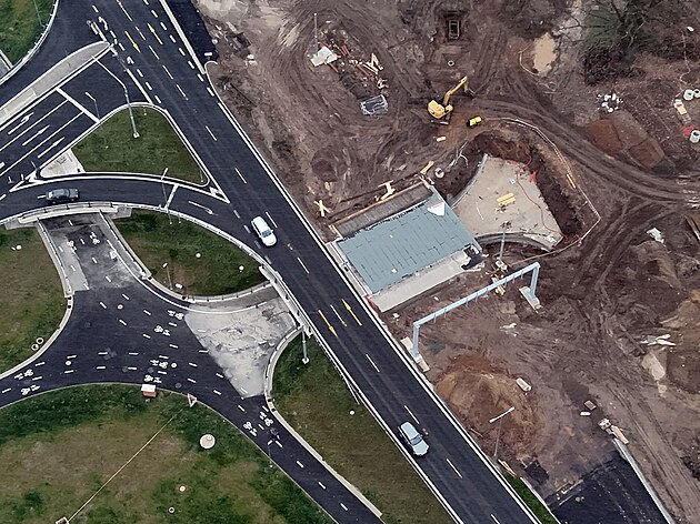 Pohled z dronu na rozestavěnou křižovatku Mileta. Nyní pokračují práce na vybudování podchodů, především pod Sokolskou ulicí. Stavbaři dokončují i prostor před vjezdem do fakultní nemocnice. (prosinec 2025)