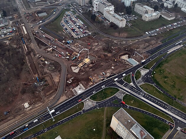 Dělníci na stavbě křižovatky Mileta v Hradci Králové postupují na přeložkách inženýrských sítí a dokončují nové stezky a cesty v okolí. (prosinec 2025)