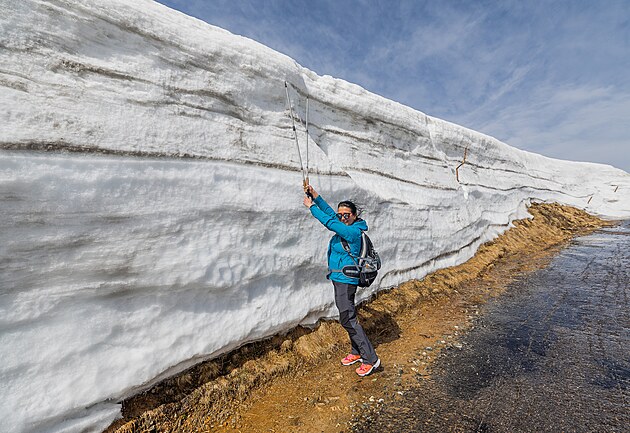 Cyklisté a pěší turisté si i přes silný vítr užívají výlet okolo Luční boudy v Krkonoších, kde fréza vytvořila ze sněhu efektní bariéry (17. dubna 2025).