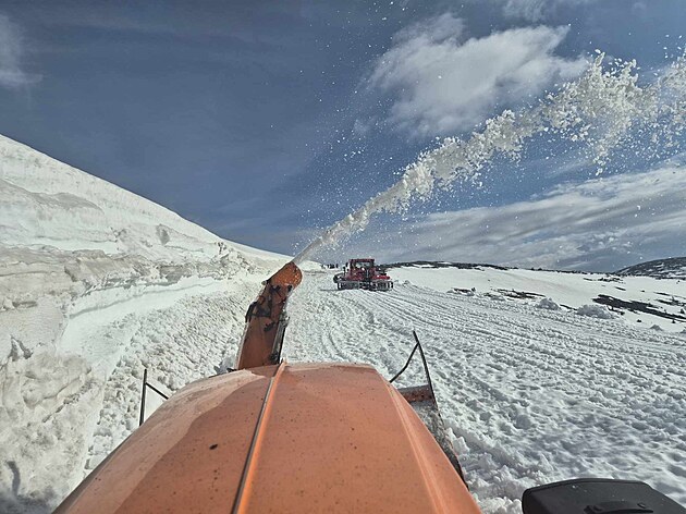 Frézování horské silnice mezi Výrovkou a Luční boudou v Krkonoších (14. dubna 2025)