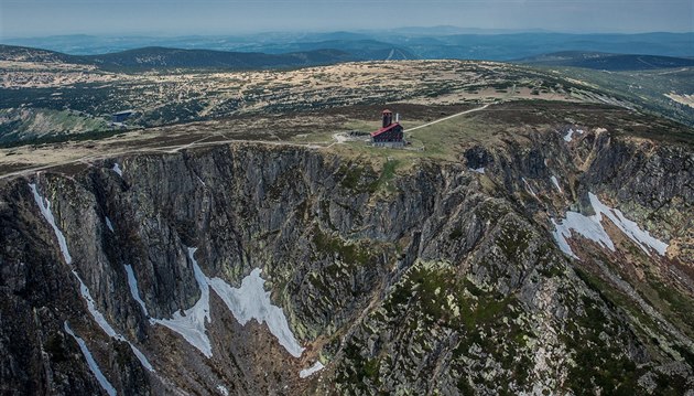 Sněžné jámy zachycené z letadla z polské strany Krkonoš (30. 5. 2017)