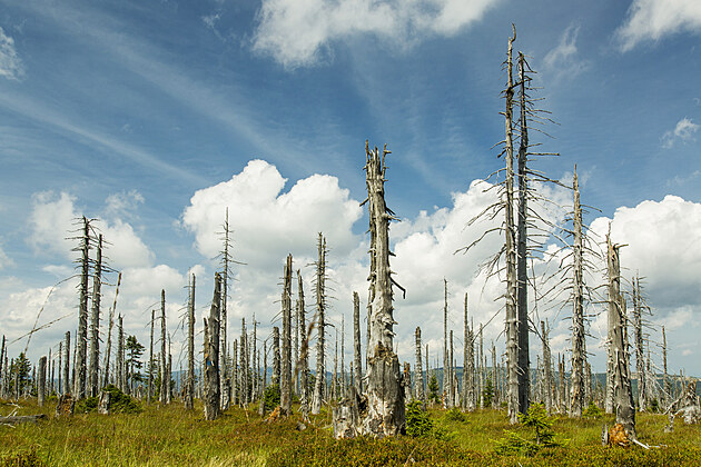 Stojící mrtvé stromy vytvářejí vhodné prostředí pro nový les, snímek je zhruba z roku 2010. Dnes jsou podle odborníků zdejší lesy v nejlepší kondici za několik staletí.