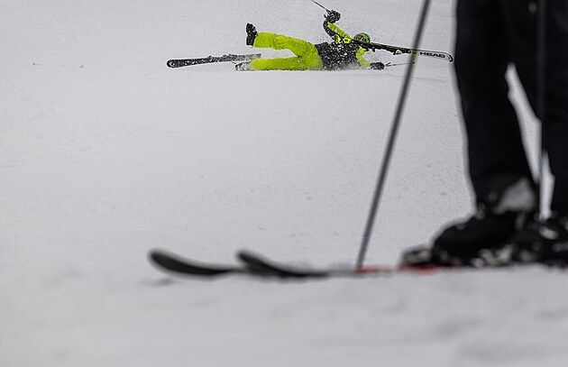 Na svahy do Pece pod Sněžkou vyrazily v dešti a větru jen desítky lyžařů a snowboardistů. (19. prosince 2024)