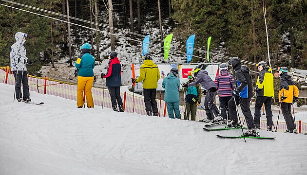 Na svahy do Pece pod Sněžkou vyrazily v dešti a větru jen desítky lyžařů a snowboardistů. (19. prosince 2024)