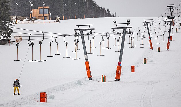 Na svahy do Pece pod Sněžkou vyrazily v dešti a větru jen desítky lyžařů a snowboardistů. (19. prosince 2024)