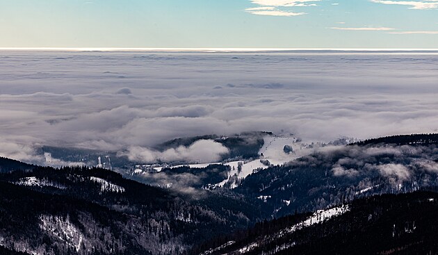 Dole oblačnost, nahoře jasno. Inverze čarovala s výhledy z Krkonoš.
