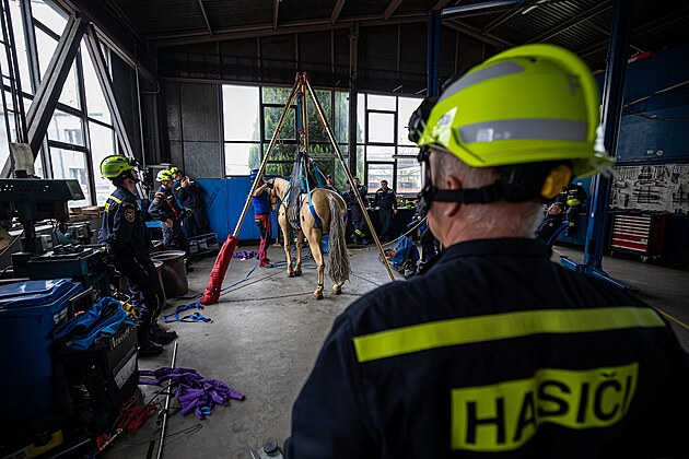 Specializované školení zaměřené na záchranu a manipulaci s velkými zvířaty, výcvik vedl Tomáš Förchtgott z organizace Horse Emergency. Na snímku je nová záchranná síť pro koně. (30. září 2025)