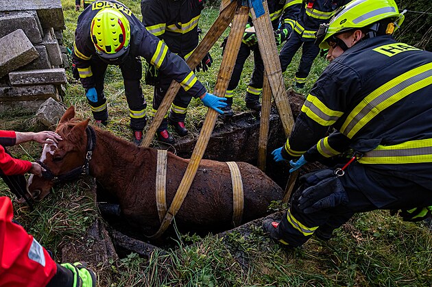 Speciální síť v Bolehošťské Lhotě nebyla po ruce, proto hasiči uvázali koně do popruhů. (31. října 2025)