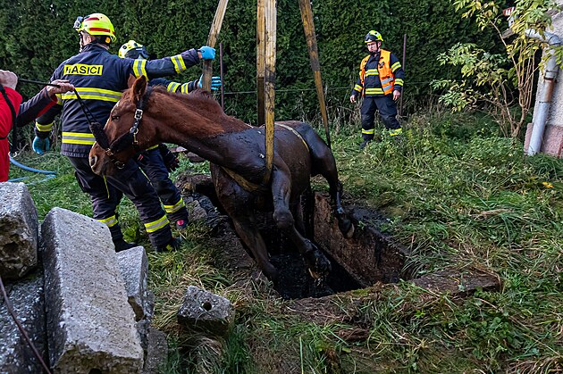 Hasiči v Bolehošťské Lhotě zachraňovali koně z jímky. (31. října 2025)