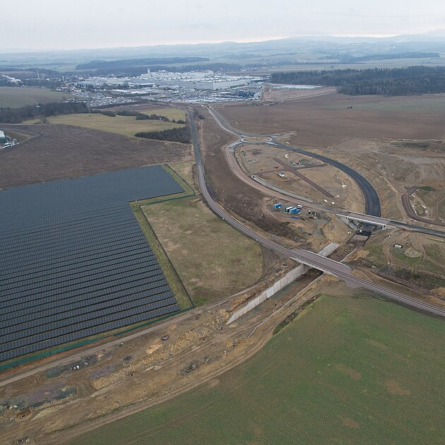 Nově vybudované komunikace v budoucí průmyslové zóně Solnice-jih. V pozadí závod Škoda Auto Kvasiny.