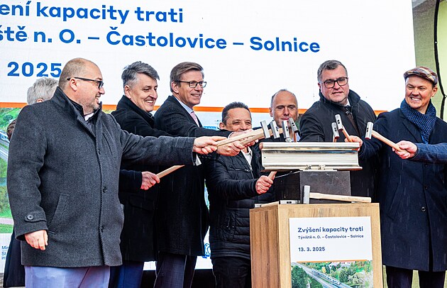 Zahájení stavby zkapacitnění trati z Týniště nad Orlicí do Solnice se účastnil (druhý a třetí zleva) generální ředitel Správy železnic Jiří Svoboda a ministr dopravy Martin Kupka (ODS).