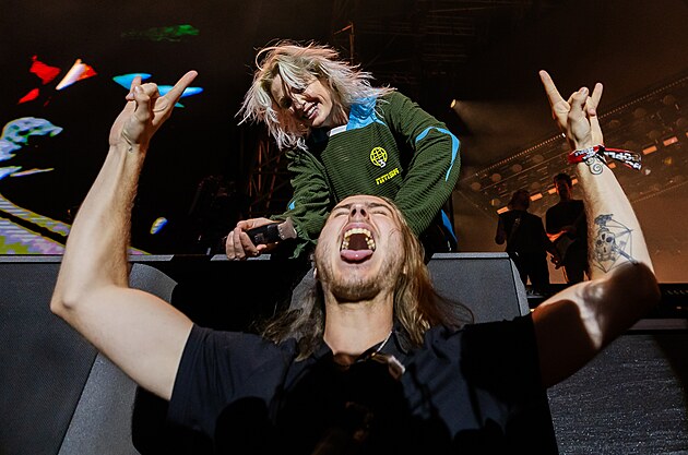 Zpěvačka Linkin Park Emily Armstrong stříhá fanouška na koncertě na festivalu Rock for People (14. června 2025, Hradec Králové).
