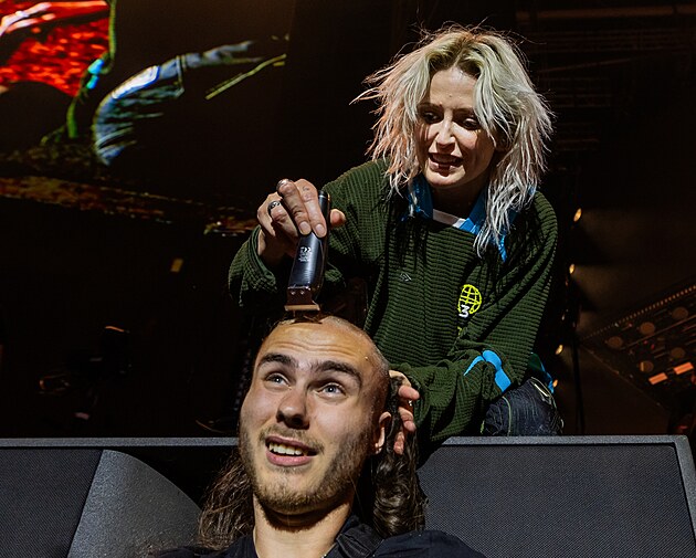 Zpěvačka Linkin Park Emily Armstrong stříhá fanouška na koncertě na festivalu Rock for People (14. června 2025, Hradec Králové).