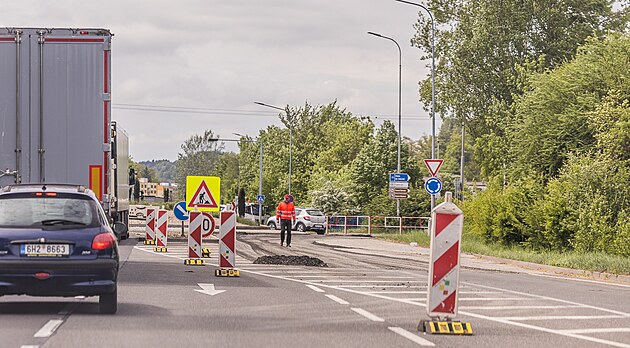Na hlavním tahu I/33 od hranice k centru Náchoda opravují polovinu okružní křižovatky u Kauflandu, řidiči projedou kyvadlově. (5. května 2025)
