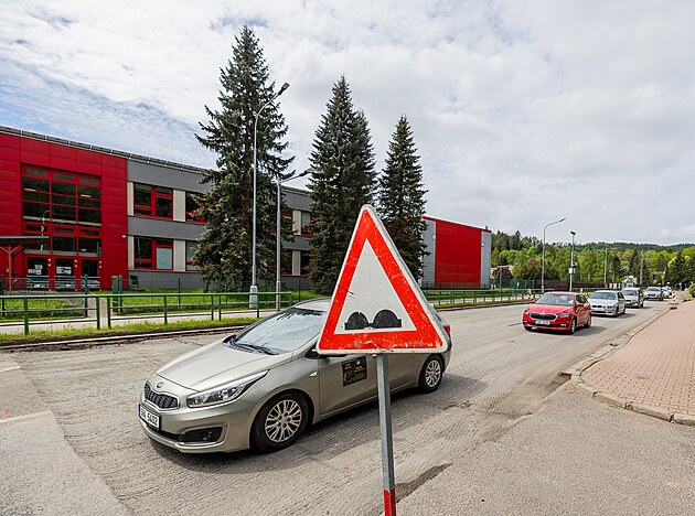Na náchodském sídlišti Plhov stavbaři opravují 200metrový úsek silnice I/14. Auta tam pouští kyvadlově. (5. května 2025)