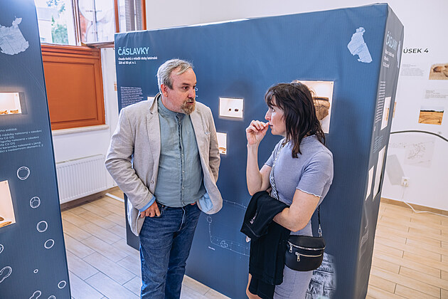 Vernisáž výstavy Cesta do pravěku Náchodska, vlevo je archeolog z hradecké univerzity Ladislav Rytíř. (13. června 2025)