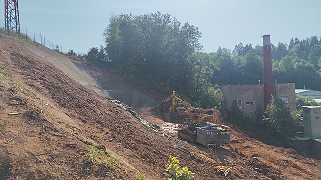 Bagry pracují na odkrytí budoucího portálu tunelu, který bude ústit u nynější silnice mezi Dolní Radechovou a Náchodem. (15. srpna 2025)