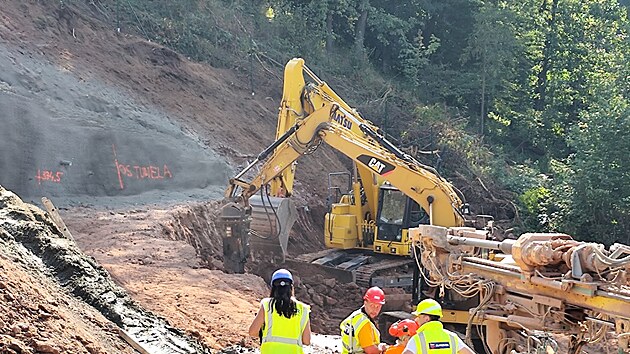 Bagry pracují na odkrytí budoucího portálu tunelu, který bude ústit u nynější silnice mezi Dolní Radechovou a Náchodem. (15. srpna 2025)