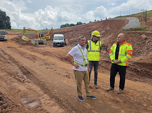 Náchodský starosta Jan Birke (vpravo) a předseda polské části Euroregionu Glacensis Czesław Krecichwost při kontrolní návštěvě stavby obchvatu Náchoda (15. července 2025)