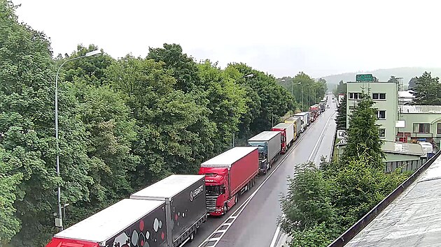 Kolona hlavně kamionů na vjezdu do Náchoda od polské hranice po deváté dopoledne (8. července 2025)