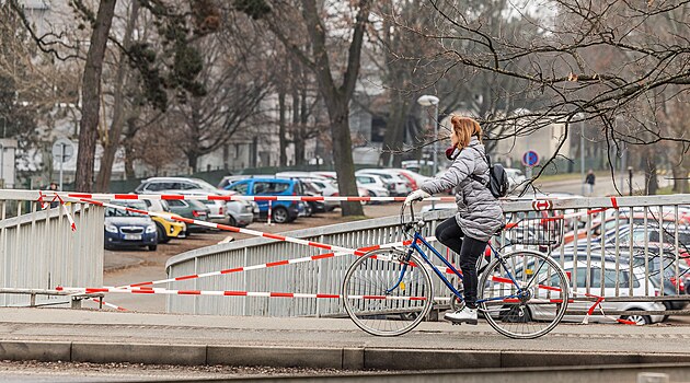 Cyklisté a chodci si musí najít jiné cesty, aby se dostali na hradecký most U Soutoku. Čtyři ramena jsou uzavřená. (22. ledna 2025)