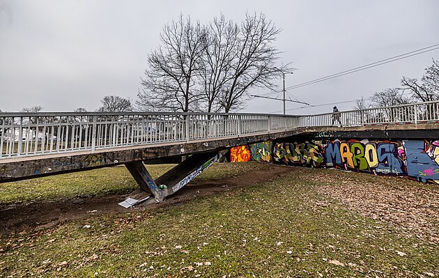 Cyklisté a chodci si musí najít jiné cesty, aby se dostali na hradecký most U Soutoku. Čtyři ramena jsou uzavřená. (22. ledna 2025)