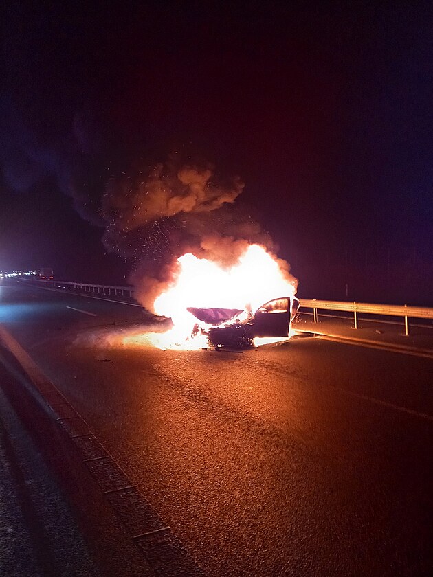 Požár osobního vozu na D11 u Smiřic na Hradecku (26.11.2024).