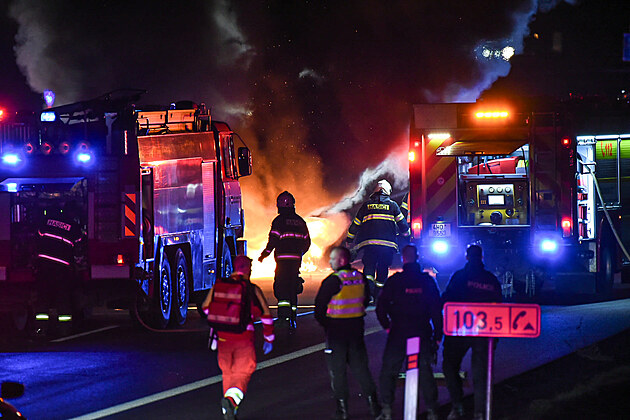 Požár osobního auta po nárazu do svodidel na D11 u Smiřic (26.11.2024).