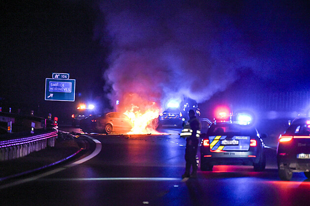Požár osobního auta po nárazu do svodidel na D11 u Smiřic (26.11.2024).