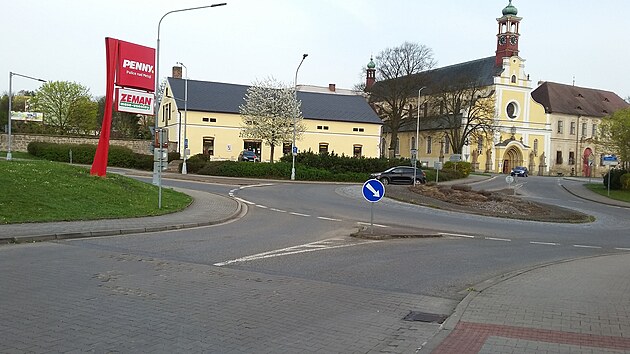 Příjezd k Penny marketu v Polici nad Metují, u nějž se stala nehoda. (9. dubna 2024)