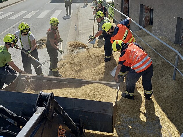 Obilí z převráceného vleku ve Vamberku zasypalo rodinný dům.