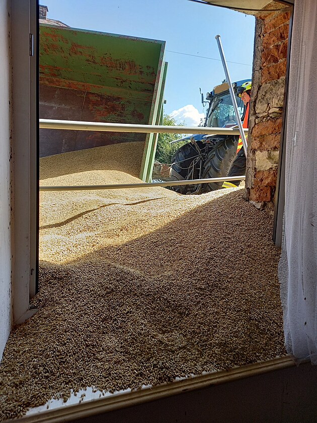 Obilí z převráceného vleku ve Vamberku zasypalo rodinný dům.