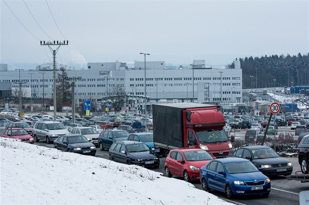 Kolony vozidel po konci směny v závodu Škoda Auto Kvasiny