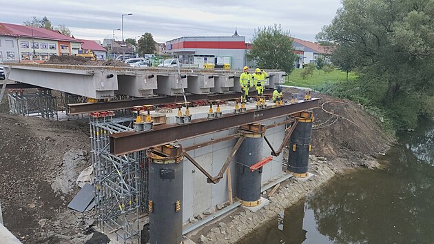 Vedle starého mostu v Týništi nad Orlicí už osazují nový. (25. září 2025)
