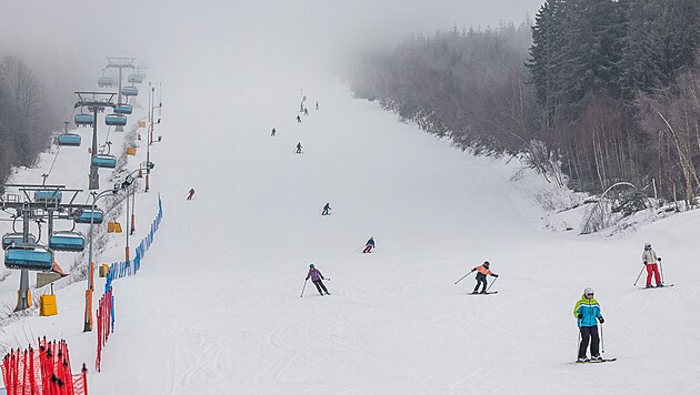 Na Studeném vrchu v Deštném při otevření šestisedačky panovala mlha a sněžilo. (10. ledna 2025)