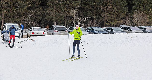 Běžkaři vyrážejí z parkoviště pod Šerlichem na hřeben Orlických hor. (1. ledna 2025)